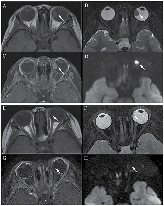 Magnetic resonance imaging (MRI) has the advantages of using no harmful radiation and of having high soft tissue resolution. MRI can improve tumor stage diagnoses by providing detailed information, including an evaluation of intraocular tumor extension (i.e., to the choroid, sclera, and/or prelaminar optic nerve) and extraocular (postlaminar or orbital invasion) or intracranial (pineoblastoma or metastases) tumor spread. Few studies have reported the efficacy of treatment with IAC using ophthalmoscopy and ocular US [8, 9], and these did not assess the extraocular (postlaminar or orbital invasion) or intracranial tumor metastases due to poor curative effects. Therefore, MRI could have an important role in follow-up examinations after conservative treatment with IAC to assess the response to therapy, tumor progression, and recurrence, to complement the findings from funduscopy.
