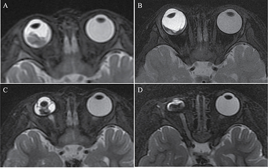 The MRI data were evaluated by two observers (YH.L and SX.C, with 25 and 3 years of experience with orbital and brain MRI, respectively). Two observers used a picture archiving and communication system to independently review the MRI data and draw regions of interest on tumors and bilateral eyeballs. Both the T2-weighted images and contrast-enhanced T1-weighted images were used to evaluate the following features: the size of the tumor (maximum diameter, thickness and maximum surface area); distance of the tumor to the optic disk (≥ 2 mm from the optic disk, < 2 mm from the optic disk, or totally or partially covering the optic disk); the optic nerve enhancement (prelaminar or postlaminar) and the enhancement degree of the tumor (non-enhancement, without enhancement; mild enhancement, the enhancement degree was greater than the brain parenchyma, but was less than the extraocular muscles; moderate enhancement, the enhancement degree was comparable to that of the extraocular muscles, but was less than the conjunctiva; obviously enhancement, the enhancement degree was parallel to conjunctiva). T2-weighted MRIs were also used to assess vitreous or subretinal hemorrhage and retinal detachment, and to measure the size of the bilateral eyeballs. The size of the tumor included the maximum diameter (the largest continuous line through the tumor mass on axial contrast-enhanced T1W images),the thickness (the maximum longitudinal diameter of the tumor on coronal or sagittal contrast-enhanced T1W images) and the maximum surface area (the largest sectional area of the tumor on axial contrast-enhanced T1W images). The MCSA, AL, and ED on T2 weighted images were used to represent the size of the eyeballs in order to compare the changes of eyeball size before and after treatment. MCSA was defined as the maximum cross-sectional area of the eye outline, with the boundary in the scleral outer edge. AL was defined as the distance between the anterior corneal surface and inner surfaces of the sclera, and was measured in the optic axis, which is a line that passes through the center of the lens, perpendicular to its anterior and posterior surfaces. ED was defined as the maximum distance between the inner surfaces of the sclera, perpendicular to the AL. The “enlargement” was defined as the size of the affected eyeball was > 5% for MCSA and > 1 mm for AL or ED than the contralateral eyeball and the “shrink” was defined as the size of the affected eyeball was < 5% for MCSA and < 1 mm for AL or ED than the contralateral eyeball.