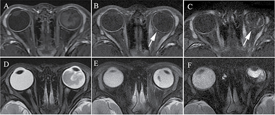 Figure 6: Retinoblastoma of the left eyeball in a 47-month-old male (patient 5). The axial contrast-enhanced T1-weighted, fat-saturated MRI (A–C) show regular enhancement of the choroid in the left eyeball (A), and decreasing and thinning of the choroid was present when compared with the contralateral eyeball in the first month after two cycles of IAC (B). Intermittent and irregular enhancement of the choroid was present in the fifth month after IAC (C). (D–F) The axial T2-weighted MRI show a progressive shrinkage of the left globe after IAC.