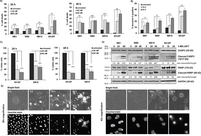 Figure 1: MG-2477 induces cell death in different neuroblastoma cell lines. (A) The cell lines NB1, NB8, NB15, and SH-EP were treated for 24 (left panel) and 48 hours (right panel) with 20 and 50 nM MG-2477 or (B) subjected to Annexin V staining after 18 and 24 hours of treatment with 50 nM MG-2477. The cells were analyzed by flow cytometry (A) for PI staining of fragmented nuclei (three independent experiments) and (B) Annexin V positivity (four independent experiments). (C) Cell viability was assessed by AlamarBlue assay of SH-EP and NB15 cells after treatment with 20 or 50 nM MG-2477 for 24 (left panel) or 48 hours (right panel). Shown is the mean of five independent experiments. Statistical difference between untreated and MG2477-treated cells was assessed by unpaired t-test (significantly different: *P< 0.05; **P<0.01; ***P<0.001). (D) NB1, NB8, and NB15 cells were treated with 50 nM MG-2477 for 24 and 48 hours and SH-EP cells for 16 and 24 hours. CASP3 and PARP levels/cleavage were analyzed by immunoblot. GAPDH served as loading control. Densitometric analyses were done using Labworks software and expressed as cleaved/full length ratio. (E) SH-EP cells were treated with 50 nM MG-2477 up to 24 hours. Cell morphology was monitored by bright field microscopy after 3, 15 and 24 hours at 20x (left) and 63x (right) magnification; nuclei were stained with 100 ng/ml Hoechst33342 stain. Size marker in the left panel is 50 μm, in the right panel 20 μm.