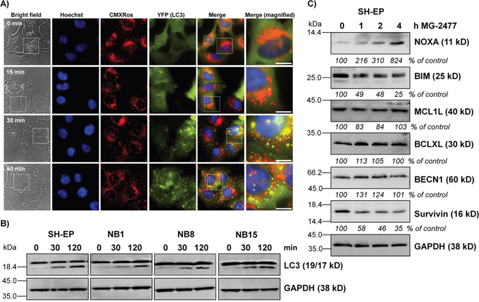Figure 2: MG-2477 induces rapid and extensive autophagosome formation. (A) SH-EP/YFP-LC3 cells were treated with 50 nM MG-2477. Autophagosome formation was monitored via live-cell microscopy up to one hour. Mitochondria were stained with MitoTrackerRed/CMXRos (300 nM), nuclei were stained with Hoechst33342 (100 ng/ml). Bar is 10 μm. (B) SH-EP, NB1, NB8, and NB15 cells were incubated for 30 and 120 minutes with 50 nM MG-2477. Cell lysates were subjected to immunoblot analyses for LC3 conversion. GAPDH served as loading control. (C) Immunoblot analyses of NOXA, BIM, MCL1L, BCLXL, BECN1, and Survivin expression after treatment of SH-EP cells for the times as indicated with 50 nM MG-2477. GAPDH served as loading control. Intensities of protein bands were quantified by densitometry, untreated cells were set as 100%.