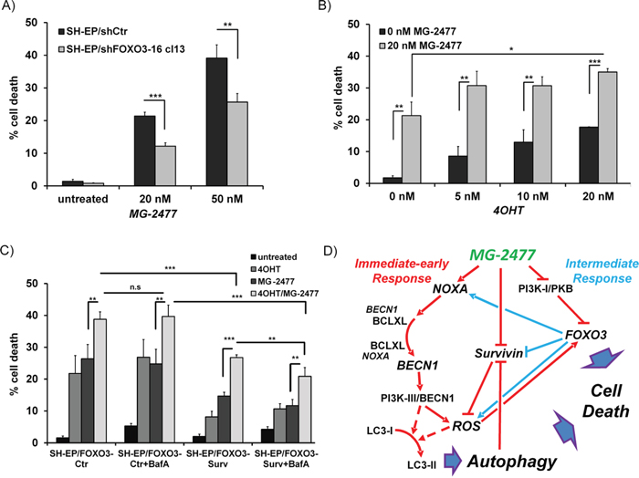 Figure 8: FOXO3-activation enhances MG-2477-induced cell death. (A) SH-EP/shCtr and SH-EP/shFOXO3-16 cl13 cells were incubated with 20 or 50 nM MG-2477 for 24 hours and cell death was measured by PI-FACS analyses (shown is the mean of three independent experiments). (B) SH-EP/FOXO3 cells were treated with 20 nM MG-2477 alone or in combination with increasing amounts of 4OHT (5 to 20 nM) for 24 hours and analyzed for PI-stained nuclei by flow cytometry. (C) SH-EP/FOXO3-Ctr and SH-EP/FOXO3- Surv cells were pre-incubated with 20 nM 4OHT (24 hours) and/or 100 nM BafA (30 minutes) before addition of 35 nM MG-2477 for another 24 hours. Shown is the mean of four independent experiments. Statistical difference in all experiments was assessed by unpaired t-test (***P<0.001; **P<0.01, *P<0.05). (D) Schematic model of the molecular events triggered by MG-2477 treatment in neuroblastoma cells: In the immediate early phase (red lines), MG-2477 treatment increases NOXA expression, which replaces BECN1 from BCLXL. This triggers ROS downstream of the PI3K-III/BECN1 complex, which results in LC3 conversion, autophagosome formation and autophagic flux. In parallel, Survivin steady state levels decrease, which according to earlier studies from our lab further promotes ROS accumulation. MG-2477 represses the PI3K-I/PKB pathway leading to FOXO3 nuclear accumulation (intermediate phase, blue lines) and to further activation of cellular ROS. In this cell system we have demonstrated before that FOXO3 among other death-related targets induces NOXA and represses Survivin and thereby further perpetuates authophagy and drives the cells into cell death.