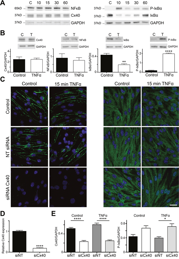 Figure 3: Cx40 dampens NFκB nuclear translocation in a mouse EC line. (A) Lysates of bEnd.3 cells incubated or not with 10 ng/ml TNFα for 10, 15, 30 or 60 min were immunoblotted against NFκB, Cx40, IκBα, Phospho-IκBα or GAPDH. Whereas expression levels of NFκB, Cx40, and GAPDH were not affected by short-term stimulation with TNFα, the treatment induced phosphorylation and degradation of IκBα. (B) Quantification of (A) under control conditions or after incubation with 10 ng/ml TNFα for 15 min. N=3. (C) Expression of Cx40 (left panels) or NFκB (right panels; both in green) in control bEnd.3 cells and after 15 min stimulation with 10 ng/ml TNFα treated or not with siRNA for Cx40 or NT-siRNA. Note that in ECs in which Cx40 was silenced with siRNA (lower panels), NFκB translocation to the nucleus was enhanced after stimulation with TNFα. DAPI (blue). Scale bar represents 15 μm. (D) Cx40 expression in bEnd.3 cells exposed to Cx40 siRNA or NT-siRNA was assessed by real-time qPCR. N=3. (E) Expression of Cx40 (left) or Phospho-IκBα (right) in control bEnd.3 cells and after 15 min stimulation with 10 ng/ml TNFα treated with siRNA for Cx40 or NT-siRNA. N=3.
