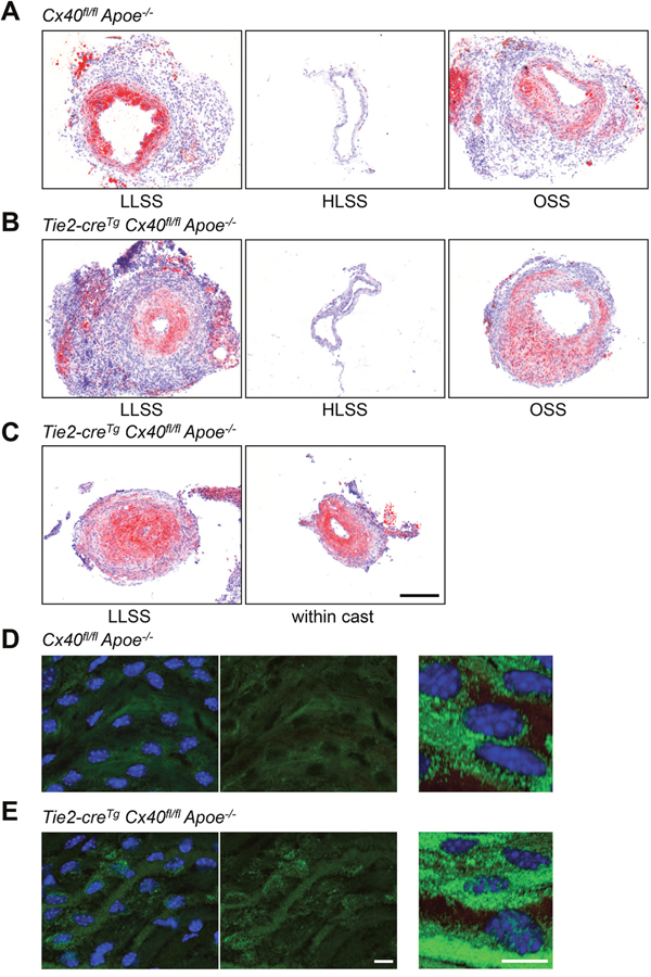 Figure 5: Exaggerated flow-induced atherosclerosis in Apoe-/- mice with endothelial deletion of Cx40. Representative images of SudanIV stainings are shown for the 3 flow regions of casted vessels (LLSS, HLSS, OSS) from Cx40fl/flApoe-/- (A) and Tie2-creTgCx40fl/flApoe-/- (B, C) mice after 6 weeks of high-cholesterol diet. Intimal thickening was present in regions subjected to LLSS and OSS in Cx40fl/flApoe-/- mice (A). Intimal thickening in response to LLSS and OSS was increased in Tie2-creTgCx40fl/flApoe-/- mice (B). The increased atherosclerotic response caused in half of the Tie2-creTg Cx40fl/flApoe-/- mice a complete occlusion of the LLSS area that gave rise to atherosclerotic lesions within the cast (C). N=6-8 animals per group. Scale bar = 200 μm. (D, E) En face immunostaining for NFκB (in green) in carotid arteries of Cx40fl/flApoe-/- (D) and Tie2-creTgCx40fl/flApoe-/- (E) mice. Note that NFκB signal was mostly cytoplasmic in Cx40fl/flApoe-/- mice and more frequently localized to the nucleus in Tie2-creTgCx40fl/flApoe-/- mice. DAPI (blue). Scale bar represents 10 μm.