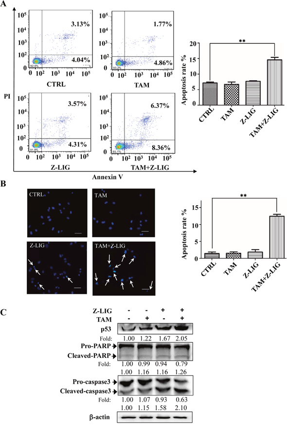 Figure 2: Combinatorial Z-LIG and TAM induced cell apoptosis. MDA-MB-231 cells were treated with Z-LIG (50 μM) and TAM (5 μM) alone or their combination for 72 h. (A) Apoptotic cells were quantified by flow cytometry after stained with FITC-conjugated Annexin V and PI. (B) Morphologic change of apoptotic cells was evaluated by Hoechst 33342 staining. The scar bar is 50 μm. (C) The expression of apoptosis-related proteins as indicated were determined by Western blotting. β-actin was used as an internal control. The blots were a representative of three independent experiments. Values represent mean ± SD. *p< 0.05, **p< 0.01 compared with control.