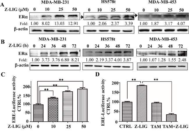 Figure 4: Z-LIG reactivated ERα expression and transcriptional activity in ERα- breast cancer cells. (A-B) The expression of ERα protein in MDA-MB-231, Hs578t and MDA-MB-453 cells was determined by Western blotting after treatment with Z-LIG at different concentrations and time points. The western blots were a representative of three independent experiments. β-actin was used as an internal control. (C-D) The transcriptional activities of ERα was examined in MDA-MB-231 cells by luciferase reporter gene assay. Cells were transfected with the ERE-luciferase plasmids construct, then treated with Z-LIG with indicated concentrations or Z-LIG (50 μM) and TAM (5 μM) alone or their combination for 72 h and finally evaluated with the Dual-Luciferase Reporter Assay System. The transcriptional activity was presented as percentage of control. Values are presented as the mean ± SD of three independent experiments. *p< 0.05, **p< 0.01 compared with control.