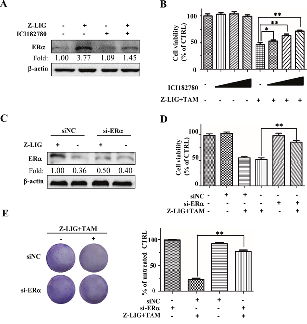 Figure 5: ICI and si-ERα reversed the growth inhibition of Combinatorial Z-LIG and TAM in MDA-MB-231 cells. (A) MDA-MB-231 cells were pre-treated with 100 nM ICI182780 or vehicle for 12 h, and then with or without Z-LIG (50 μM) for another 72 h. ERα expression was analyzed by Western blotting. (B) The cell viability was detected by SRB assay. Cells were pre-treated with vehicle or different concentrations of ICI (10,100,1000 nM) for 12h and then treated with or without Z-LIG (50 μM) combined with TAM (5 μM) for another 72h. (C) The expression of ERα was measured by Western blotting in si-NC or si-ERα-transfected MDA-MB-231 cells treated with or without Z-LIG (50 μM) for 72 h. (D) The cell viability was detected by SRB assay after MDA-MB-231 cells were transfected with si-NC or si-ERα, and then treated with or without Z-LIG (50 μM) combined with TAM (5 μM) for another 72h. (E) Colony formation assay was performed in MDA-MB-231 cells that first transfected with si-NC or si-ERα, and then treated with combinatorial Z-LIG (25 μM) and TAM (2.5 μM) and allowed to grow for two weeks before stained with 0.005% crystal violet. Values represent mean ± SD. The blots or images were a representative of three independent experiments. *p< 0.05, **p< 0.01 compared with control.