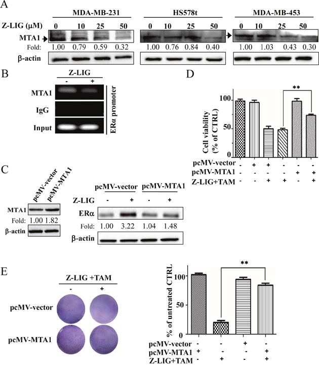 Z-LIG decreased MTA1 expression and its recruitment to the ERα promoter