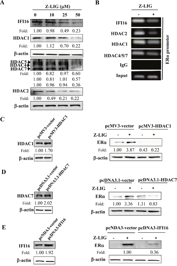 Z-LIG decreased IFI16 and HDACs expression and recruitment to the ERα promoter