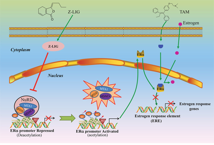 ERα, Estrogen receptor alpha; TAM, Tamoxifen; Z-LIG, Z-ligustilide; IFI16, IFN-γ–inducible protein 16; HDACs, Histone deacetylases; MTA1, Metastasis-associated protein 1; ERE, Estrogen response elements; 5-aza-dc, 5-aza-20-deoxycytidine; TSA, trichostatin A; NuRD, nucleosome remodeling and histone deacetylase; TCM, traditional Chinese medicine; VORAS, volatile oil of Radix Angelica Sinensis; Nrf2, nuclear factor-erythroid-2-related factor 2; SRB, Sulforhodamine B; CDK, Cyclin dependent dependent kinase; acetyl-p53, acetylation of p53; ICI, ICI 182780; Ace-H3, acetylation of histone H3; pcMV-MTA1, pcMV-His-MTA1; pcDNA3.1-HDAC7, pcDNA3.1-FLAG-HDAC7; pcDNA3-IFI16, pcDNA3-FLAG-IFI16; IP, immunoprecipitation; EGCG, (-)-epigallocatechin-3-gallate; SFN, sulforaphane; PI, propidiumiodide; PMSF, phenylmethylsulfonyl fluoride; PVDF, polyvinylidene difluoride; ECL, chemiluminescence; ChIP, Chromatin immunoprecipitation