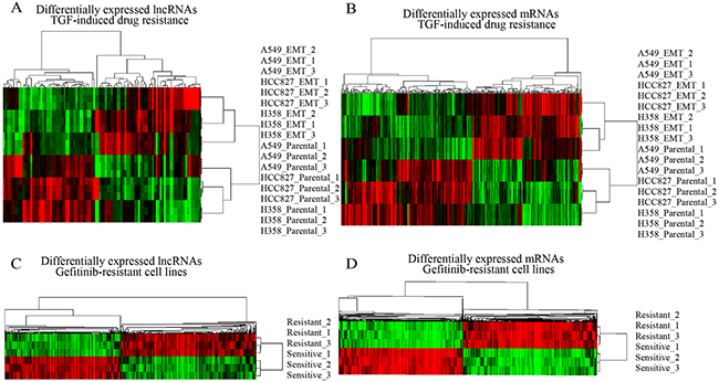 Figure 1: Expression differences of lncRNAs and mRNAs in drug resistance lung cancer cell lines. (A and B) Hierarchical clustering analysis of differentially expressed lncRNAs and coding mRNAs in multidrug-resistant/sensitivity lung cancer cell lines; (C and D) in Gifitinib resistant lung cancer cell lines. Colors ranged from green (low expression) to red (high expression), representing the relative expression levels of lncRNAs and mRNAs.