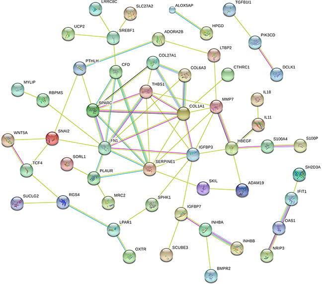 Functional enrichment analysis based on GO Terms was performed for differentially expressed mRNAs, which significantly participated in cancer-related pathways, such as PI3K-Akt pathways, p53 pathways, VEGF pathways, Hippo pathway (Figure 3). To further mine the resistant-associated genes, we performed protein-protein interaction (PPI) network analysis. 52 genes were involved in our dataset and used to depict their complex relationship in PPI analysis (Figure 4).