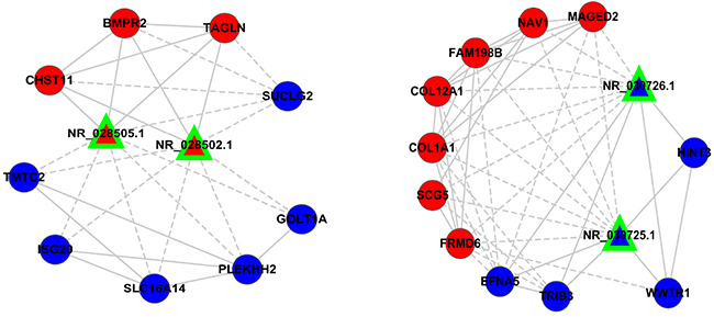 Figure 5: Co-expression pattern of lncRNAs-mRNAs in drug resistance of lung cancer. Interaction network of lncRNAs-mRNAs. Signal pathway networks of mRNAs involved in lncRNAs-mRNAs relationships. The triangle nodes indicate lncRNAs, circular nodes indicate the mRNAs, the solid line shows their positive and direct connections, and dotted line shows a negative correlation.