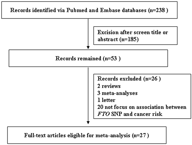 A flow chart describing the process of inclusion/exclusion of studies is presented in Figure 1. The literature search identified a total of 238 potentially relevant articles. At last, a total of 27 publications (129,467 cancer cases and 290,633 normal controls) were included in our meta-analysis. There were 24 publications (113780 cases and 210593 controls) for FTO rs9939609 SNP, 5 publications (1594 cases and 2034 controls) for FTO rs1477196 SNP, and 3 publications (14144 cases and 79973 controls) for rs11075995 variant. All three SNPs in the each of included studies were in Hardy-Weinberg Equivalent. The characteristics of the included studies are listed in Table 1.