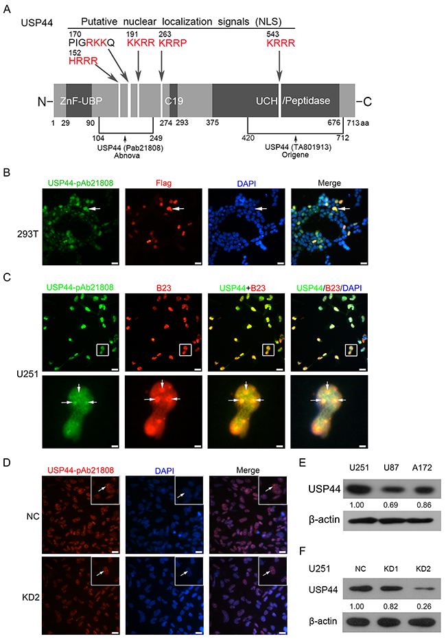 Laboratory of Paul J. Galardy had verified several specific anti-USP44 antibodies, but none of them could detect endogenous USP44 by immunoblotting [13]. We examined the specificity of anti-USP44 antibodies recognizing different epitopes obtained from Abnova (pAb21808) and Origene (TA801913, 1D1). The antibody from Abnova detected endogenous USP44 more efficiently and specifically in both western blot and immunofluorescence assays. For illustration purpose, we included a schematic diagram here demonstrating the primary structural features of USP44 protein labeled with antibody combining sites and putative nuclear localization sites (Figure 1A). 293T cells were transfected with Flag-tagged USP44 protein. This fusion protein was detectable by immunofluorescence with both anti-USP44 antibody (Abnova pAb21808) and anti-flag antibody at the same position of cells (Figure 1B). Further, secondary antibodies labeled with FITC and Alexa-Fluor-594 were used to detect the accurate localization of endogenous USP44 and B23 (a nucleolus marker), respectivelyin U251MG cells. The signals of USP44 (green) and B23 (red) significantly overlapped in nucleolus, which indicates that USP44 shares the same subcellular localization with B23 in nucleolus (Figure 3C). Furthermore, the antibody (Abnova pAb21808) also performed excellently in detecting the difference of USP44 signal between U251-NC cells and U251-USP44-KD2 cells in immunofluorescence assay (Figure 1D). This specific antibody can also distinguish the expression level of USP44 in U251MG, U87MG, A172 and transfected U251MG cells by immunobloting (Figure 1E/1F). According to our data, we confirmed the specificity of the antibody in recognizing endogenous USP44 and the nucleolar localization of USP44. siRNA2# (KD2) presented a higher interferential efficiency than siRNA1# (KD1); therefore, we chose siRNA2# to perform the following experiments (Figure 1D/1F). The data of Origene (TA801913, 1D1) were shown as supplementary material (Supplementary Figure 1).