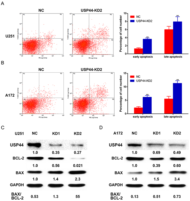 Figure 4: Knockdown of USP44 induces apoptosis in glioma cells. (A) U251-USP44-KD2 cell and NC cell stained with PE and 7-AAD were analyzed by flow cytometry, the difference percentage of early and late apoptosis was displayed in the right histogram (**p<0.01). (B) A172-USP44-KD2 cell and NC cells were analyzed as mentioned above; the data was shown in histogram on the right(**p<0.01). (C/D) Apoptosis-related proteins (Bcl-2, BAX) were detected by western blot with specific antibodies and β-actin was served as the control of sample loading. The rate of BAX/BCL-2 was presented under the blotting.