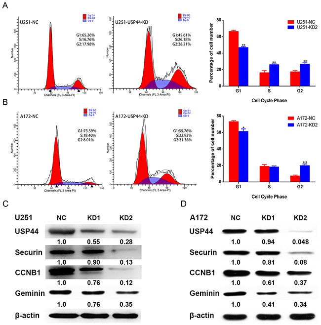 Figure 5: Down-regulation of USP44 arrest cell cycle in G2/M phase. (A/B) Cell cycle distribution was analyzed by flow cytometry with PI-stainedU251-USP44-KD2 cells, A172-USP44-KD2 cells and corresponding NC cells. Difference of the distribution was shown in histograms on the right (*p<0.05, **p<0.01). (C/D) Expression of cell cycle-associated protein (CCNB1, securin, and geminin) were blotted by western blot with the specific antibodies, β-actin was served as the control of sample loading.