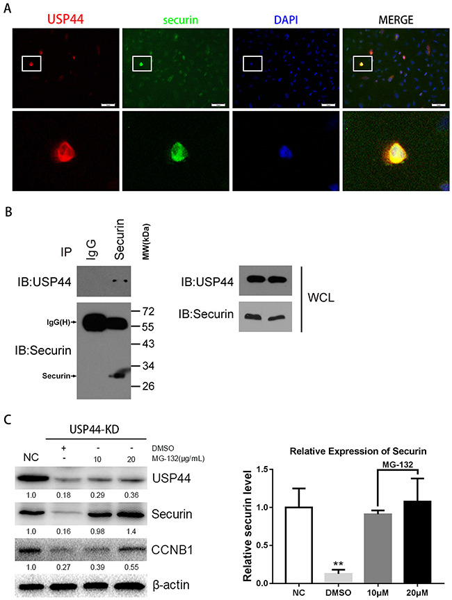 Figure 6: Interaction of endogenous USP44 and securin. (A) Immunofluorescence signals of USP44 (green) and securin (red) were overlapped in U251MG cells. DAPI was used for nuclei staining. Scale bar, 50μm. (B) Sample was collected from abundant U251MG cells for immunoprecipitation with anti-securin antibody. IP sample was analyzed by western blotting with antibodies against the USP44 and securin. (C) The samples from U251-USP44-KD2 cells treated with 10μg/ml, 20μg/ml MG-132 (inhibitor of proteasome) or equal DMSO were analyzed by western blotting with the antibodies against securin and CCNB1. The relative level of securin was shown in histogram on the right (**p<0.01).