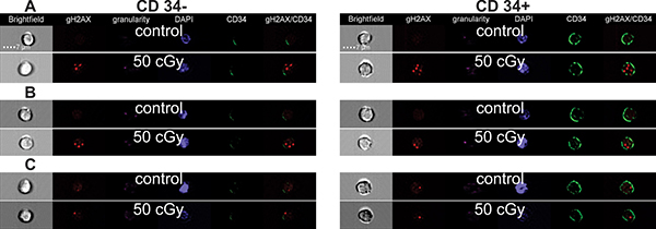 Figure 3: Representative images of cells. Representative images of CD34+ HSPC (right column) and CD34- Ly (left column) acquired by the imaging flow cytometry. The irradiated (50 cGy) and control cells at 30 min (A), 2 h (B), and 18 h (C) post-irradiation are shown.
