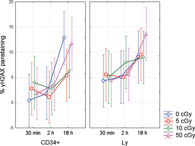 Figure 4: DNA repair foci in CD34+/- UCB cells. γH2AX foci enumerated by the imaging flow cytometry. UCB MNC were irradiated with γ-rays (0, 5, 10, and 50 cGy) and then lymphocytes (Ly) and CD34+ HSPC were analyzed at different time points (30 min, 2 and 18 h) after irradiation. The mean value from 4 experiments along with 95% confidence interval is shown in each data point.