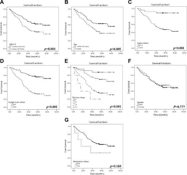 To investigate the relationship between plasma sHLA-G and the survival of the CRC patients, sHLA-G was stratified to two groups as below (sHLA-Glow) or above (sHLA-Ghigh) the median of 36.8 U/ml. The significance of other factors for the prognosis such as patient gender, age, extent of primary tumor (T), regional lymphnode status (N), distant metastases (M), and disease stage was also analyzed.