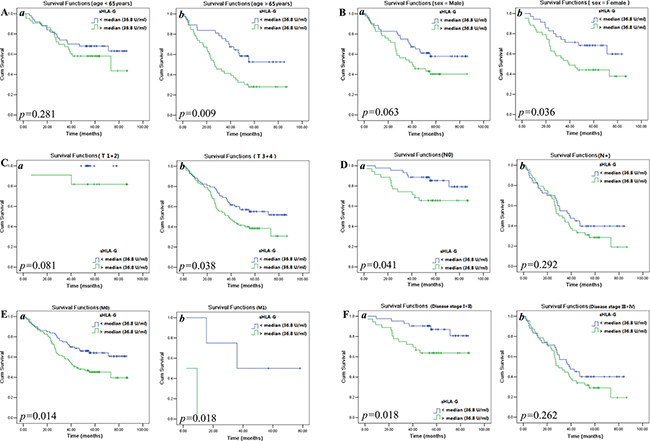 Then, we analyzed the prognostic significance of sHLA-G with stratification of clinical parameters in CRC patients. Briefly, patient gender were stratified to male and female, age stratified to below and above the median age (65 years), categories T stratified to T1 + 2 and T3 + 4, N stratified to N0 and N1 + 2, M stratified to M0 and M1, and clinical disease stage was stratified to I + II and III + IV, respectively.
