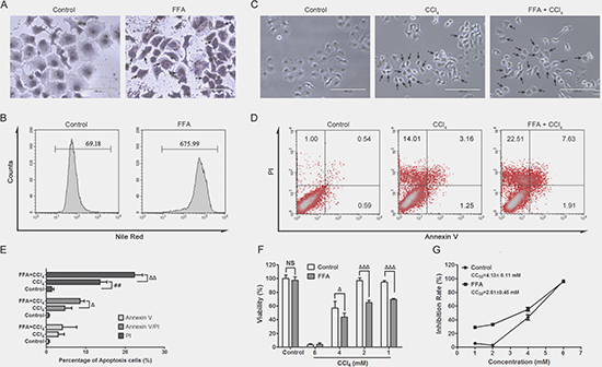 Figure 1: FFA and CCl4 inudce cell apoptosis. The effects of FFA treatment on co-cultured HepG2 cells with 0.5 mM oleic acid and 0.25 mM palmitic acid for 24 h , and lipid accumulation was determined by Oil red O (A) and Nile red staining (B). (HepG2 cells were treated with CCl4 (4 mM)) alone for 24 h, or 24 h FFA incubation followed by another 24 h CCl4 (4 mM) co-culture Representative images of the morphological change were obtained (C), the arrows indicate the typical apoptotic cells, magnification, 200×. Cell apoptosis was analysed by flow cytometry using the annexin V (FITC)/PI binding assay (D), and the percentage of apoptotic cells was calculated (E). The effects of on cell viability (F) upon CCl4 treatment (1 mM, 2 mM, 4 mM and 6 mM for 24 h) was determined by the crystal violet colorimetric assay, and was calculated CC50 (G). The data were presented as the mean ± sd of three independent experiments. Statistical analysis was performed by comparing the viability of cells treated with or without FFA. ##p < 0.01, vs control cells; ∆p < 0.05, ∆∆p < 0.01, ∆∆∆p < 0.001 vs CCl4 stimulated cells; NS = no significant difference.