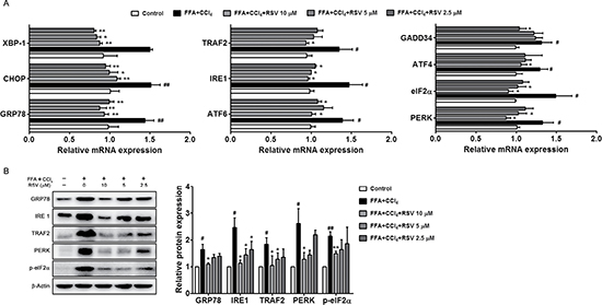 Figure 4: The effect of RSV on ER stress related molecules. (A) The mRNA expression of ER stress-related genes (GRP78, CHOP, XBP-1, IRE1, TRAF2, PERK, ATF6, GADD34, eIF2α and ATF4) was analysed by qRT-PCR. (B) Western blot analysis of the GRP78, IRE1, TRAF2, PERK protein expression and eIF2α phosphorylation. The values are presented as the mean ± sd of three independent experiments. #p < 0.05, ##p < 0.01 vs control cells; *p < 0.05 and **p < 0.01 vs FFA+CCl4stressed cells.