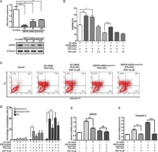 Figure 5: The effects of RSV on cells under GRP78 siRNA pre-treated condition. (A) GRP78 silencing was measured by qRT-PCR and western blot. (B) The effects of RSV on cell viability in stressed HepG2 cells under GRP78 siRNA and non-targeting (NT) siRNA conditions. (C) Apoptosis analysis of the cells by the annexin V (FITC)/PI binding assay and the percentage of apoptotic cells was calculated (D). The mRNA experession of GRP78 (E) and caspase-3 (F) expression was determined by qRT-PCR. The data were presented as the mean ± sd of three independent experiments. NS= no significant difference, **p < 0.01, **p < 0.01,***p < 0.001 vs the corresponding group.