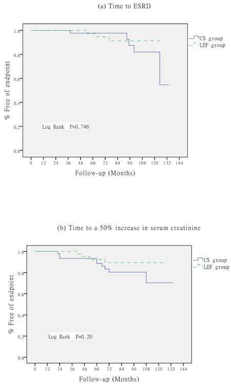 No statistically significant differences in primary outcomes were noted between groups. However, there was a trend towards better outcomes in the LEF group. The rate of ESRD was 11.1% (5/45) in the CS group vs. 7.5% (3/40) in the LEF group. A 50% increase in SCr from baseline occurred in 20% of patients (9/45) in the CS group vs. 10% of patients (4/40) in the LEF group. The cumulative probabilities of event-free survival for the primary outcomes were calculated using the Kaplan-Meier method. No significant between-treatment differences were observed (Figure 2).