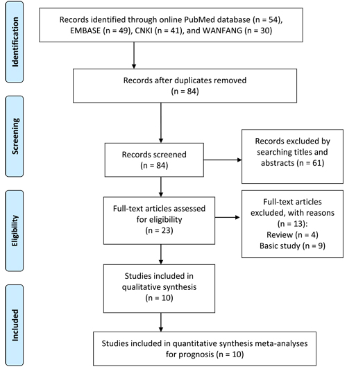 The procedure of literature inclusion and exclusion is illustrated in Figure 1. According to the predefined criteria, a total of 84 records were obtained from the online PubMed, EMBASE, Chinese National Knowledge Infrastructure (CNKI), and WANFANG databases after duplicates removed. After the manual screening, 61 citations were excluded by searching titles and abstracts. Twenty three articles received full-text evaluation, and 13 publications were discarded either because the status of reviews or basic research articles. Finally, a total of 10 cohorts were evaluated for the final meta-analysis.