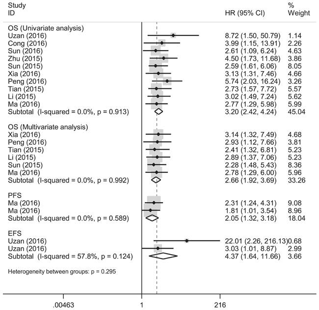 For the heterogeneity analysis checked by I-squared and Chi-squared tests, we only observed a slight degree of heterogeneity in the analysis of pooled EFS (I-squared = 57.8%), whereas other combined analyses involveded pooled of OS and PFS times, all showed no significant heterogeneity existed among studies. Additionally, heterogeneity appeared in the stratified analyses as Chemotherapy-based (I-squared = 90.1%, P = 0.001 in Chi-squared test) and down-regulated lncRNAs (I-squared = 83.2%, P = 0.003 in Chi-squared test) analyses (Table 2), and therefore the DerSimonian and Laird method was employed for statistical analysis.