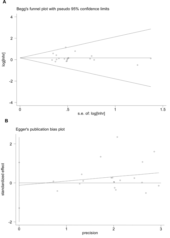 Figure 4: Publication bias of the overall pooled analyses evaluated by Bgger’s funnel plot and Egger’s publication bias plot. A. Bgger’s funnel plot (P = 0.442); B. Egger’s publication bias plot (P = 0.142).