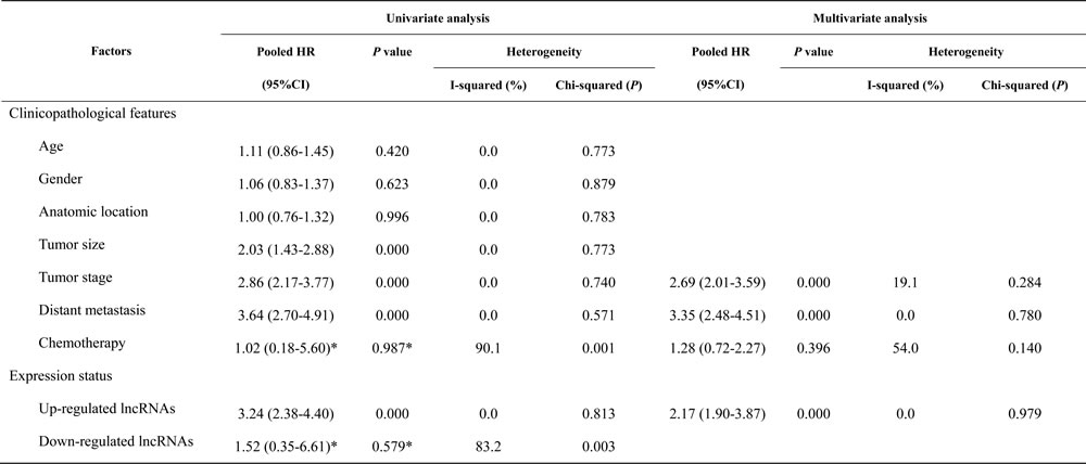 In the subgroup analysis stratified by clinicopathological features, significant negative associations were observed between OS time and the following variables: tumor size (univariate analysis: HR = 2.03, 95% CI: 1.43-2.88, P = 0.000), clinical stage (univariate analysis: HR = 2.86, 95% CI: 2.17-3.77, P = 0.000; multivariate analysis: HR = 2.69, 95% CI: 2.01-3.59, P = 0.000), and distant metastasis (univariate analysis: HR = 3.64, 95% CI: 2.70-4.91, P = 0.000; multivariate: HR = 3.35, 95% CI: 2.48-4.51, P = 0.000) (Supplementary Figure 1 to 3 and Table 2). Moreover, for the analyses based on expression status, the up-regulated lncRNAs were more likely to manifest shorter OS time (univariate analysis: HR = 3.24, 95% CI: 2.38-4.40, P = 0.000; multivariate analysis: HR = 2.17, 95% CI: 1.90-3.87, P = 0.000) compared with the down-regulated lncRNAs in osteosarcoma (Supplementary Figure 1 to 3 and Table 2). Differences across other clinicopathological variables, including age, gender, anatomic location, chemotherapy and decreased lncRNA expression were not significant.