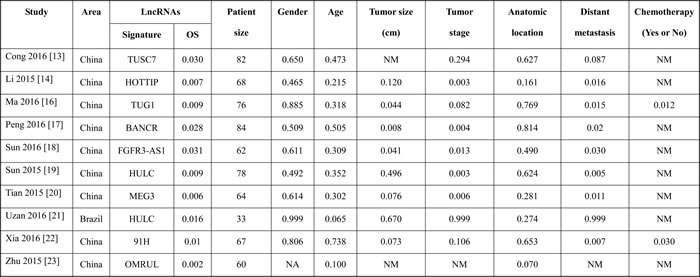 The major characteristics of each enrolled study are summarized in Table 1. Ten publications with a combined study population of 674 cases were included. All samples were retrieved prior to treatment and the final diagnosis all relied on the histopathological examinations. Expression status of all lncRNAs was determined by quantitative reverse transcription polymerase chain reaction (qRT-PCR). The reference genes comprised DAPGH [14, 17, 19-21, 23], G3PDH [22], β-actin [13, 16, 21], and 18S rRNA [18]. The primary endpoints included OS, PFS, and EFS, with a median follow-up time ranged from 25 to 60 months. The altered lncRNA expression profile possessed a total of 9 individuals, yet 7 of them (TUG1, 91H, HULC, BANCR, FGFR3-AS1, HOTTIP, and OMRUL) were overexpressed in osteosarcoma tissues/plasma, and 2 (MEG3 and TUSC7) were down-regulated.