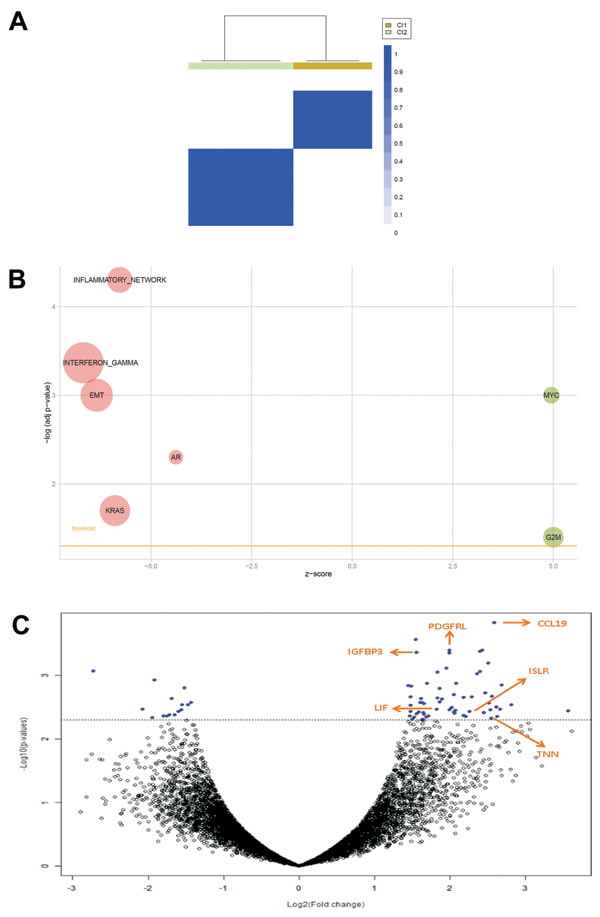 Figure 1: A. Consensus unsupervised clustering analysis. The heatmap depicts the consensus matrix imposing the presence of two clusters on the dataset. The values range from 0 (white, samples do not cluster together) to 1 (blue, samples showing high clustering affinity). B. Bubble plot of gene sets associated to DSRCT sample clusters. An overview of GSEA enriched networks was depicted through bubble plots. The x-axis indicates the z-score for each term, while the y-axis is the negative logarithm of the adjusted p-value. The area of the displayed circles is proportional to the number of genes assigned to each term. Green = pathways enriched in Cluster 1; Red = pathways enriched in Cluster 2. C. Volcano plot of log2 (fold changes) versus -log10 p-value. The volcano plot shows transcriptional differences between the two groups of samples identified by consensus unsupervised clustering analysis. The horizontal dashed line denotes the FDR<0.15 cut-off. Arrows indicate six pivotal genes.