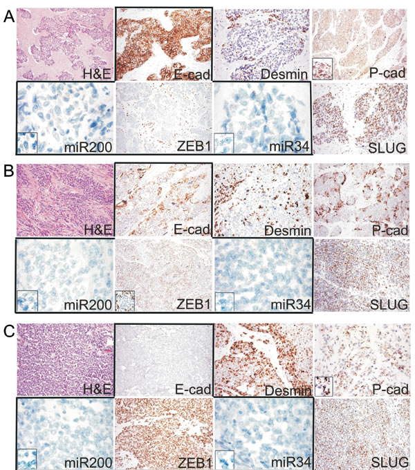 Figure 2: A. Example of the epithelial phenotype correlating with MErT, that was characterized by high miR200/miR34 and null ZEB1 expression coupled with strong E-cadherin immunoreactivity (group 1, DSRCT 2). B. Example of the hybrid/partial EMT cases that were characterised by the intermediate expression of both miRNAs and the heterogeneous expression of either ZEB1 or E-cadherin (group 2, DSRCT 5). C. Example of the EMT cases that were characterised by strong ZEB1, very low miR200/miR34, and null E-cadherin expression (group 3, DSRCT 7). The expression of SLUG was similar in all three states; desmin increased from MErT to EMT; P- cadherin was expressed in all three states, but its expression was increased in the hybrid/partial or metastable state, in which it outlined the membrane areas bounding the tumor nests. miR200/miR34: miRNA-200/miRNA-34.