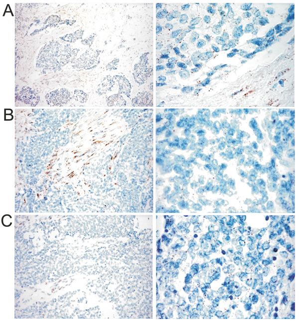 Figure 3: Example of the miRNA-21 signature in one case from each group (original magnification 200 X left column, 400 X right column). A. group 1 (DSRCT 2); B. group 2 (DSRCT 5); C. group 3 (DSRCT 7). The tumor cell expression of miRNA-21 was similar in the three groups and was enriched in signals in group 1 (A), in which it was largely expressed in stroma cells.