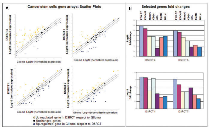 Figure 5: A. Scatter plot comparing the normalised expression of every gene between the selected DSRCT FFPE sample (Y axis) and the glioblastoma FFPE sample (X axis). The central line indicates unchanged genes. The dotted lines indicate the selected fold regulation threshold. The yellow and blue dots respectively indicate the genes in the DSRCTs that are up- and downregulated in comparison with the glioblastoma; the black dots indicate unchanged genes. B. Foldchanges were calculated using the 2 -ΔΔ Ct method with the glioblastoma sample as a reference, and are expressed as Log10.