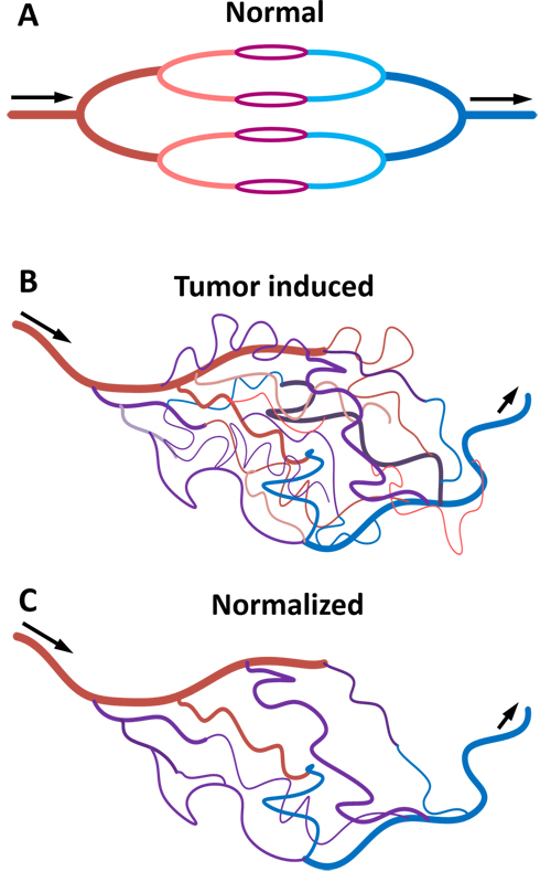Figure 1: Diagram representing blood vessels in normal tissue A., tumor tissue B. and tumor tissue after treatment with anti-angiogenic drugs C. Tumor vessels have active angiogenesis, high permeability, hypoxia and the blood flow is chaotic and slow. After anti-angiogenic therapy, tumor blood vessels recover their normal functions.