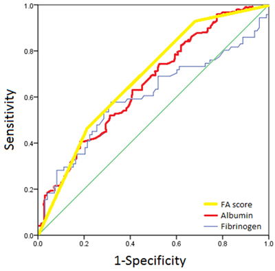 Figure 1: ROC analysis of optimal fibrinogen, albumin and FA score cutoff.