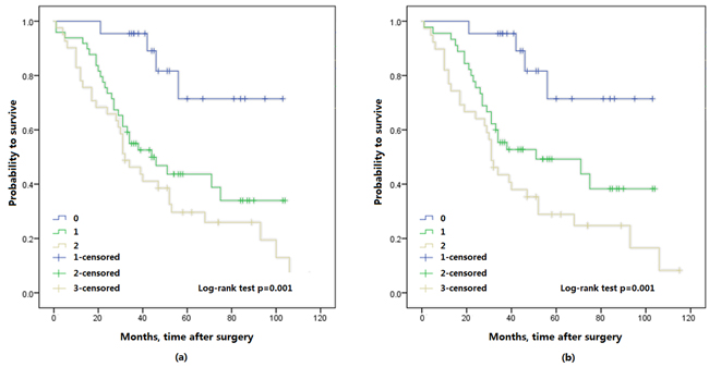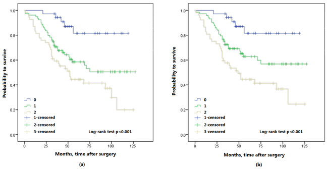 The Kaplan-Meier survival analysis showed that preoperative FA score was significantly associated with OS and CSS, a higher FA score in patients with shorter OS (p < 0.001) and CSS (p < 0.001) (Figure 2). Furthermore, 3- and 5-year OS were also identified in this study, 3-year OS was 94.3% (33/35) in FA score 0, 69.9% (51/73) in FA score 1 and 58.5% (31/53) in FA score 2. 5-year OS was 82.4% (14/17) in FA score 0, and 65.8% (25/38) in FA score 1, 48.6% (18/37) in FA score 2. Thus, FA score could predicted significantly poorer OS (p = 0.001; p = 0.037; respectively) (Figure 3).
