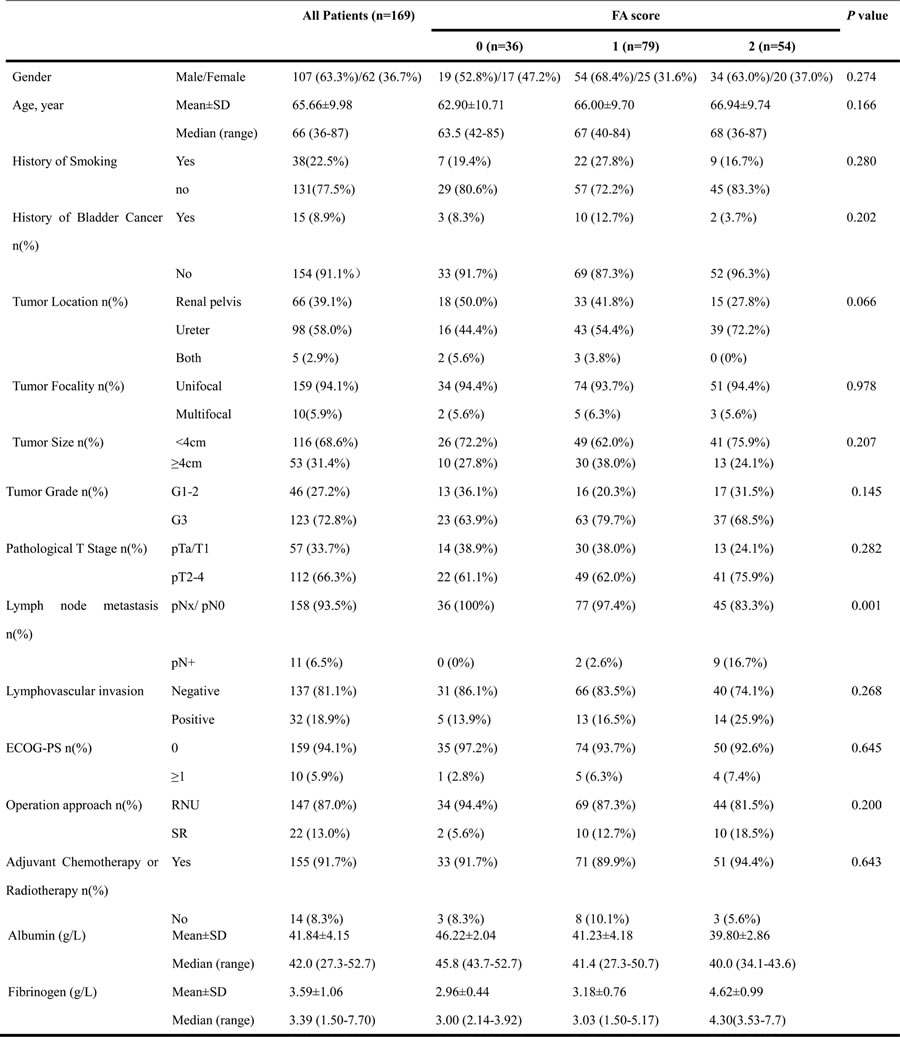 Table 1: Clinicopathologic characteristics and FA score of 169 patients with upper tract urothelial cancer (UTUC)