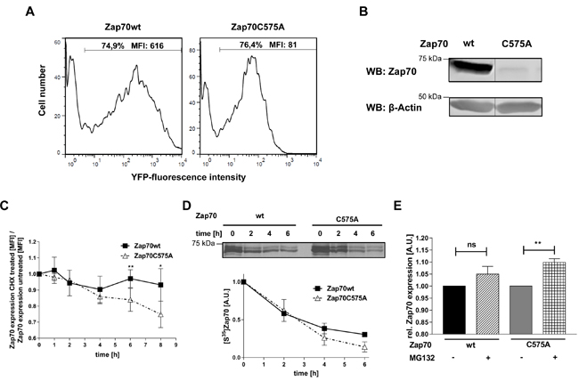 Figure 3: Analysis of protein stability of Zap70C575A. A. Representative histograms of the expression of Zap70 wt and C575A. P116 cells were transfected with YFP-tagged Zap70wt or C575A. Transfection efficiency was determined by gating on YFP+ cells. B. Zap70wt or C575A expressing P116 cells were lysed and subjected to immunoblot analysis with an antibody against human Zap70. C. P116 cells reconstituted with either Zap70wt-YFP or C575A-YFP were either left untreated or treated with 20µg/mL cycloheximide for different time points up to 8h. Zap70 protein expression was measured by flow cytometry. The values of wt and mutant Zap70-YFP MFI were normalized to the respective untreated control samples for each time point followed by normalization to the 0h time point which was set to 1 for both wt and mutant Zap70 (n = 3). D. HEK293T cells were transfected with Zap70-Myc-DDK or C575A-Myc-DDK. After starvation of cysteine and methionine, cells were pulsed with [S35]methionine/cysteine for 15min, followed by chase up to 6h. Subsequently, cells were lysed and Zap70 was immunoprecipitated using anti-FLAG antibody. Samples were separated using SDS-PAGE and signals were detected by autoradiography and quantified by densitometry (n = 2). E. Zap70wt-YFP of C575A-YFP expressing P116 cells were either treated with 20mM MG132 (+MG132) or DMSO (-MG132) for 4h. Subsequently, protein expression was measured by flow cytometry. YFP MFI values of wt and mutant Zap70 were normalized to the respective untreated control samples which were set to 1 (n = 4).