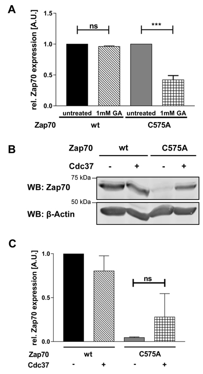 Chaperones are crucial for the regulation of protein stability. In particular, Hsp90 in conjunction with Cdc37 are known to be important for the stabilization of various PTKs [32]. Therefore, we investigated if the C575A mutation alters the interplay with these chaperons. Figure 4A clearly shows that the expression of mutant Zap70 strongly depends on Hsp90α, as inhibition of Hsp90α further destabilizes mutant but not wt Zap70. As Cdc37 appears to be a co-chaperone specifically regulating the activity and stability of kinases, we tested if the overexpression of this co-chaperone further stabilizes Zap70C575A. We have found that the overexpression of Cdc37 partially stabilizes the expression of Zap70C575A, but not Zap70wt (Figure 4B and 4C).