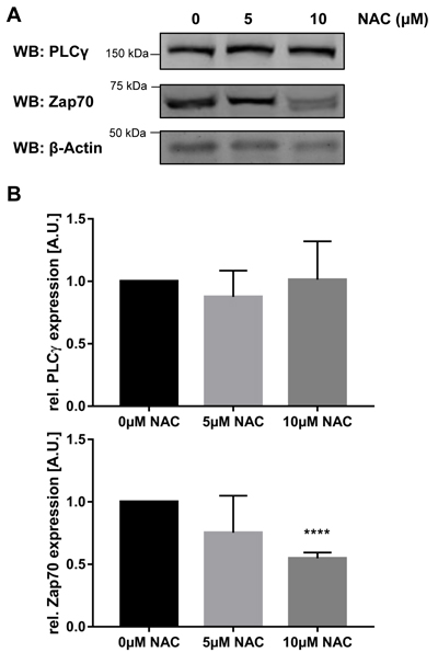Figure 5: Treatment with NAC destabilizes Zap70wt. Jurkat T cells were either left untreated or treated with 5µM or 10 µM N-acetylcysteine (NAC) for 96h. Cells were lysed and subjected to immunoblot analysis using the indicated antibodies. A. Representative western blots. B. Quantification of PLCγ and Zap70 expression (n = 3).