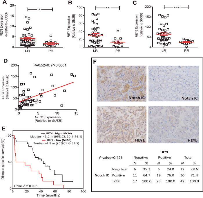 Fifty-two primary clear-cell primary tumor samples corresponding to 39 LR (75%) and 13 PR patients (25%) were analyzed. Among the different genes analyzed, only HES1, HEY and HEYL, putative effectors of Notch signaling, showed increased expression in the LR group compared to PR group (Figure 1A, 1B, and 1C, respectively; Figure 2). A significant positive internal correlation between the expression of these 3 genes was also observed (Figure 1D, and data not shown).