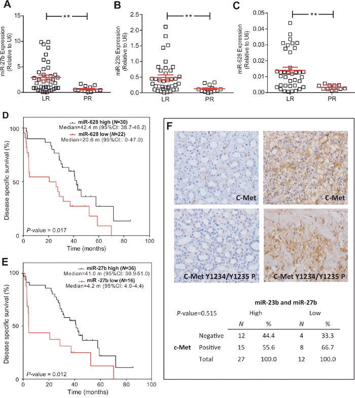 Protein, mRNA and miRNA expression (positive vs negative) were correlated with treatment outcome according to the cohorts of LR and PR. Survival probabilities were assessed by the Kaplan-Meier method. Cox proportional hazard models were used to identify predictors of treatment outcomes. To determine their ability to discriminate the two populations we sequentially performed unpaired tTest, ROC analyses and Kaplan-Meyer distributions with LogRank test. For all statistical tests, an a priori significant level of α=0.05 was assumed.
