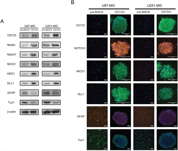 Figure 1: CD133+ U87-MG and U251-MG human GBM formed neurospheres exhibit higher stem cell marker expression, Notch activity, and elevated self-renewal abilities. (A) The protein expression of pre-MACS and sorted CD133+ cells. (B) Immunofluorescence staining of pre-MACS cells and sorted CD133+ neurospheres. Images were captured by laser confocal microscope.