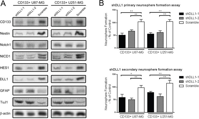Figure 2: DLL1 silencing decreased stem cell markers expression and Notch activity, and impaired the self-renewal ability of CD133+ U87-MG and U251-MG glioma neurospheres. (A) Two shRNAs targeting Notch ligand DLL1 and one scramble shRNA were transfected into CD133+ neuropshere cells. Protein expression was detected through Western blot. (B) Primary and secondary single cell neurosphere formation assay against shDLL1 CD133+ cells. (*: p<0.05, **: p<0.01).